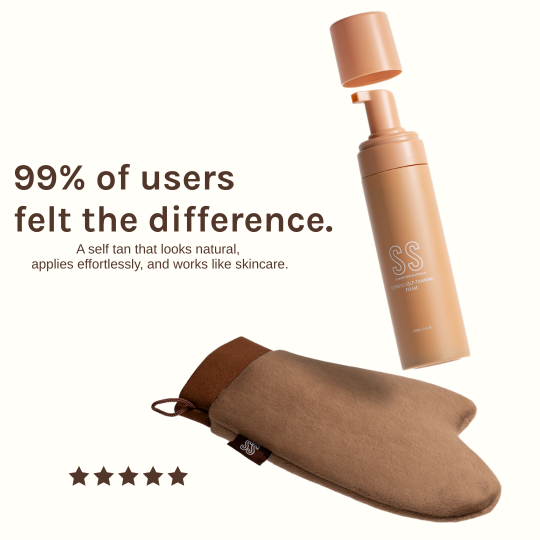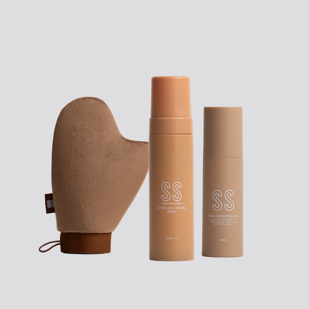 This effortless two step system (plus the perfect mitt) is your go-to for a seamless, radiant tan with zero fuss. Featuring our Express Self-Tanning Foam, Skin Repairing Oil and Tanning Mitt, this bundle delivers a flawless, natural-looking glow while deeply hydrating and soothing your skin. Tan, nourish, repair your skin barrier &  maintain your glow effortlessly.
